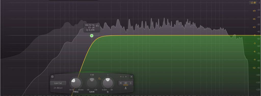 Sinon, vous pouvez tout simplement prendre un égalisateur, couper tout ce qui se trouve en bas de 160 Hz avec un filtre passe haut à 24 dB/Oct. Mixez un moment sans les basses fréquences, quand vous allez les remettre tout va sembler étrange. Il faut prendre une petite pause parce que les oreilles s’adaptent rapidement aux balances spectrales.